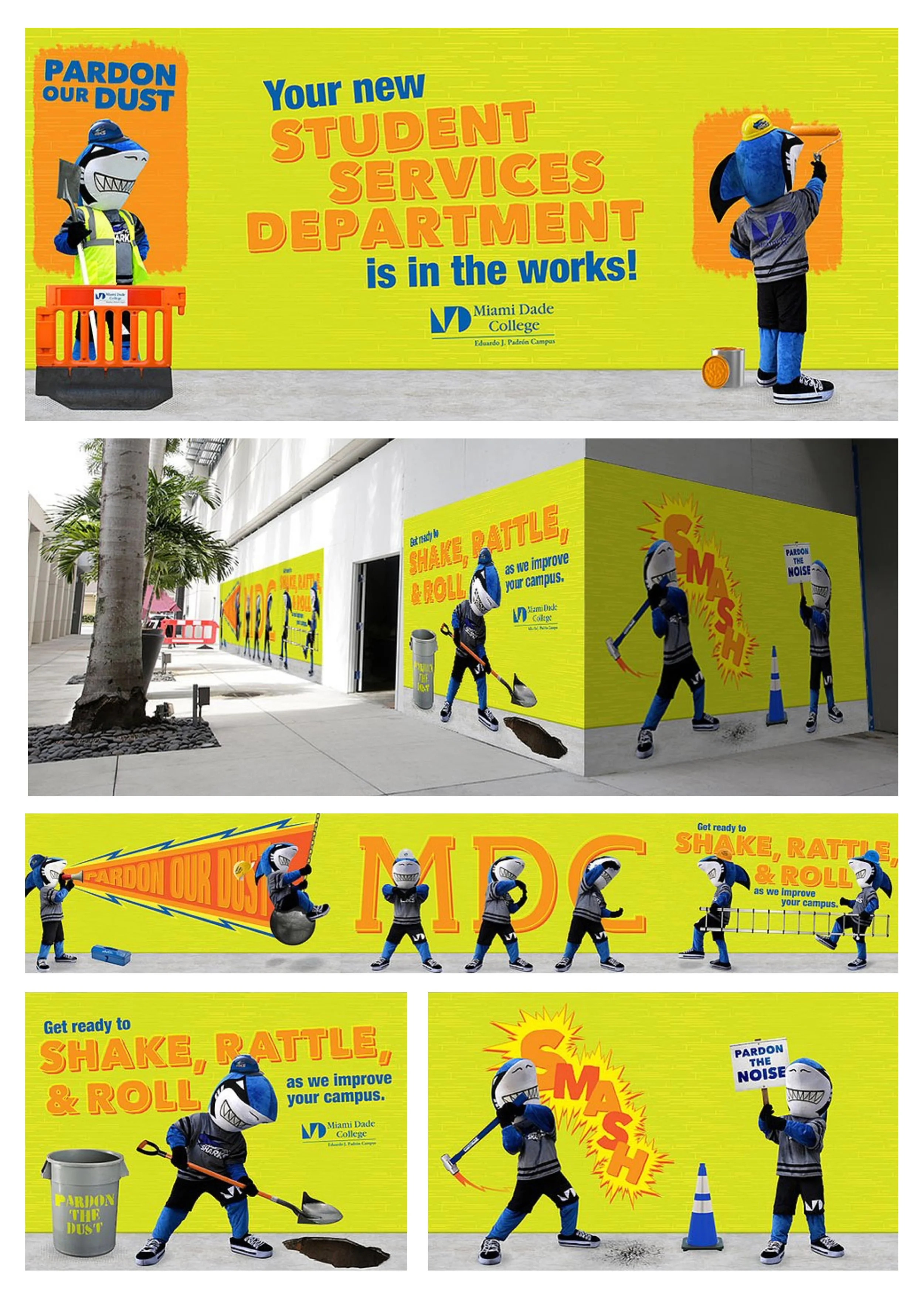 The Design Solution: To keep the tone light and student-focused, I developed a character-driven campaign featuring the college’s shark mascot. I directed a custom photoshoot with the mascot in various "construction-mode" scenarios—utilizing props like shovels, sledgehammers, and safety gear to bring the campus improvements to life. These images were integrated into a series of large-scale wall wraps featuring high-impact typography and playful puns like "Shake, Rattle, & Roll." The result was a functional piece of environmental design that effectively hid the "dust" of construction while providing a social-media-friendly backdrop that boosted student morale and reinforced the college's commitment to growth.