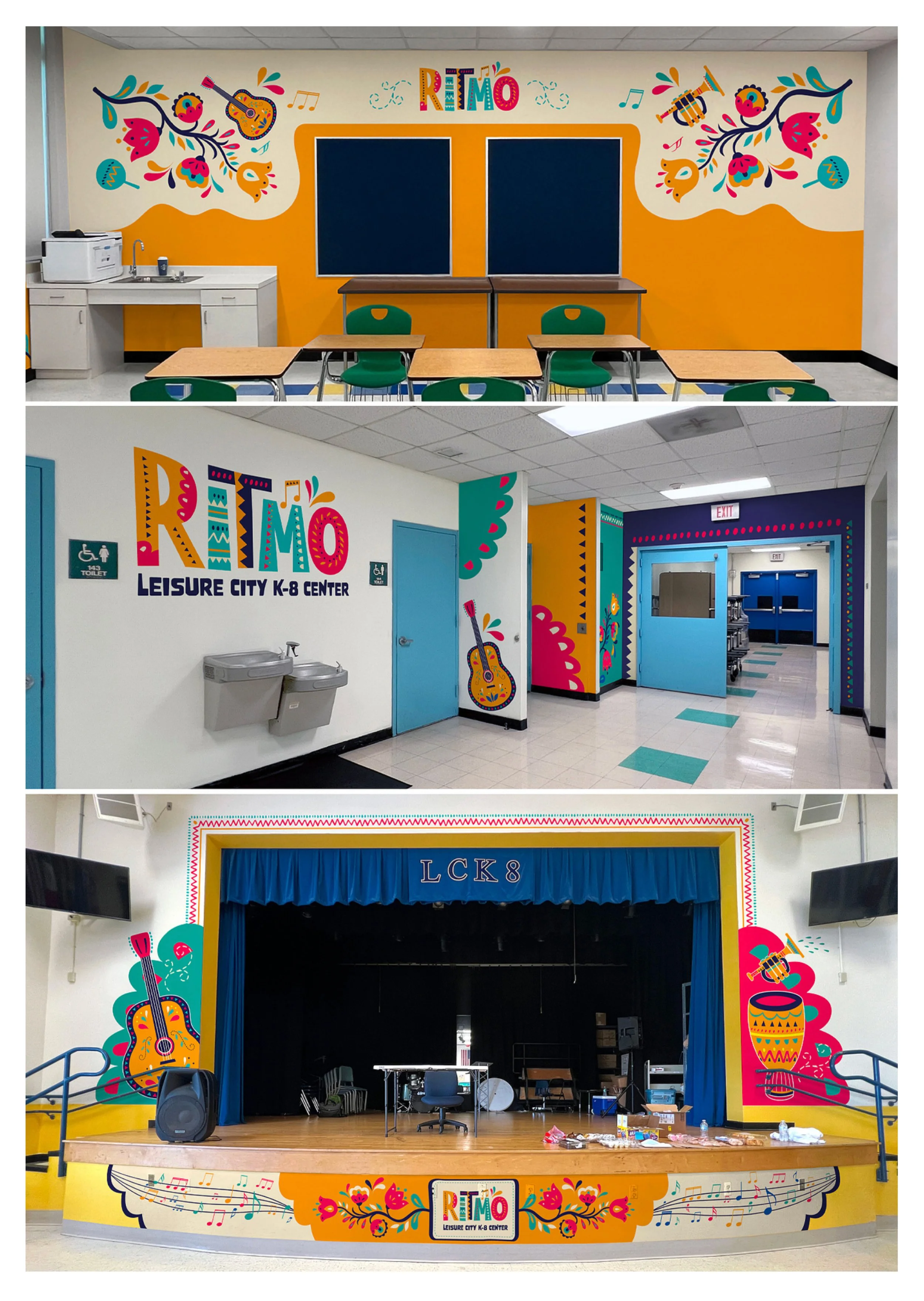 About the Project: Following the successful launch of the RITMO brand identity, the next phase was to bring that energy into the physical halls of Leisure City K-8 Center. As the first mariachi magnet program in the region, the school needed more than just a logo; it needed an immersive environment. The goal was to transform the campus—from the exterior facades to the classrooms, band room, and main stage—into a cohesive, high-vibe space that would capture the imagination of younger students and celebrate the program’s cultural roots.