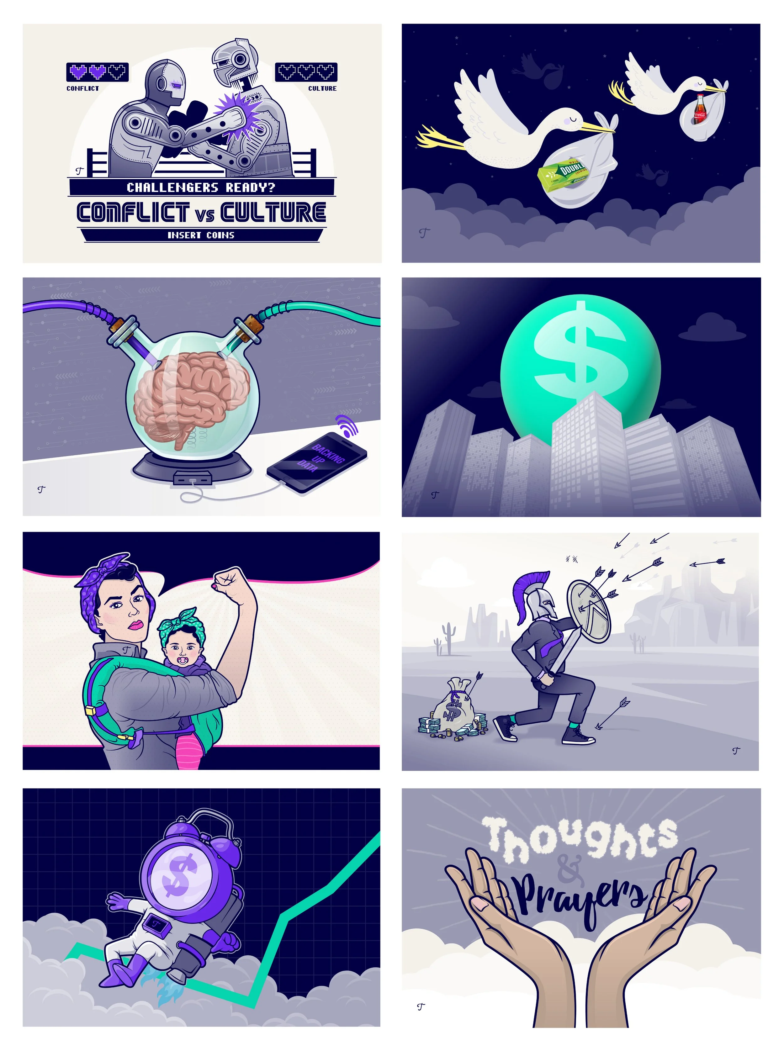 The Design Solution: I developed a library of custom editorial illustrations that translated abstract business ideas into witty, engaging visuals. Whether it was reimagining "Conflict vs. Culture" as a retro 8-bit arcade fighter or creating a modern, "hiring moms" spin on iconic pop art, each piece was designed to spark curiosity and drive reader engagement. By strictly adhering to the core Trainual color palette, I ensured that every illustration—no matter how stylistically diverse—felt like an organic part of the brand ecosystem. This consistent visual rhythm helped transform a standard newsletter into a sought-after piece of thought leadership, proving that business advice is always better when delivered with a touch of personality.